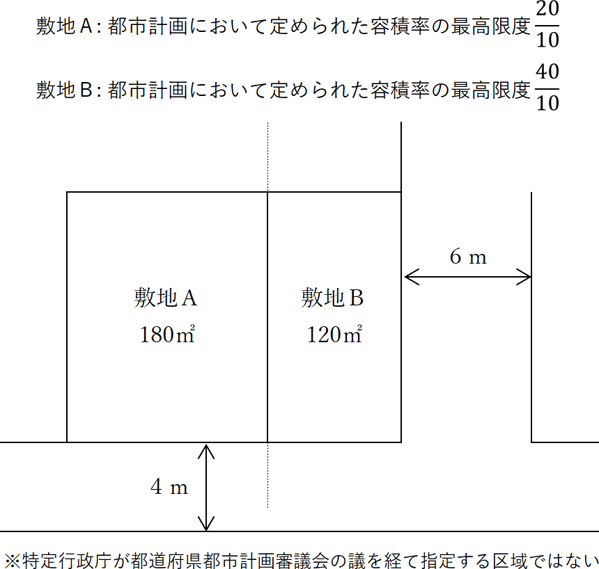 - 敷地Aのみを敷地として建築物を建築する場合、容積率の最高限度は200パーセント、建ぺい率の最高限度は60パーセントとなる。