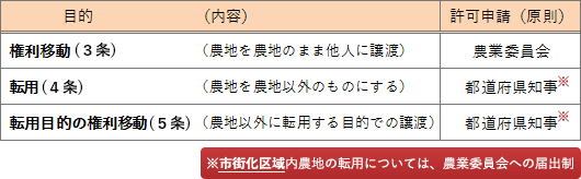 農地又は採草放牧地について所有権を移転し、又は地上権、永小作権、質権、使用貸借による権利、賃借権若しくはその他の使用及び収益を目的とする権利を設定し、若しくは移転する場合には、政令で定めるところにより、当事者が農業委員会の許可を受けなければならない。ただし、次の各号のいずれかに該当する場合及び第五条第一項本文に規定する場合は、この限りでない。