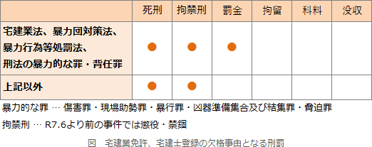 - [誤り]。本人又は役員や政令で定める使用人が罰金刑を受けたときに免許取消しとなる刑法の罪は次の6種類です。そして、その刑の執行が終わった日から5年を経過しない者がいる場合、免許を受けることができません(宅建業法5条1項6号)。
