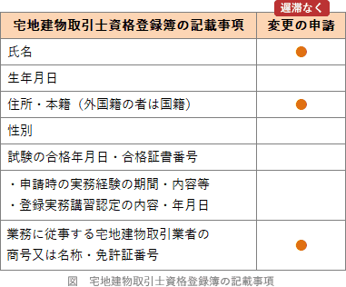 三 宅地建物取引士としてすべき事務を行い、情状が特に重いとき。 - 誤り。勤務先の宅建業者の商号・名称と免許証番号は、宅建士登録簿の登録事項となっています(宅建業法規則14条の10第1項3号)。変更があった場合には、遅滞なく、登録を受けている都道府県知事に変更の登録を申請しなければなりません(宅建業法20条)。