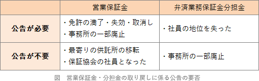 - 保証協会は、社員がその一部の事務所を廃止したことに伴って弁済業務保証金分担金を当該社員に返還しようとするときは、弁済業務保証金の還付請求権者に対し、一定期間内に認証を受けるため申し出るべき旨の公告を行わなければならない。