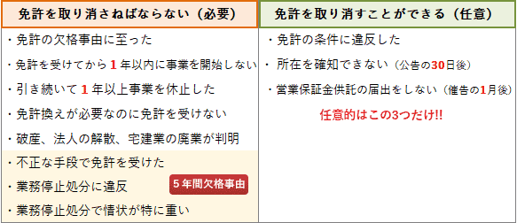 - 正しい。宅建業者が免許を受けてから1年以内に事業を開始しない場合、又は1年以上継続して休業している場合、免許権者は免許を取り消さなければなりません(宅建業法66条1項6号)。取消しの理由は、宅地建物取引業を営む意思や能力がないと認められるためです。これは必要的免許取消です。
